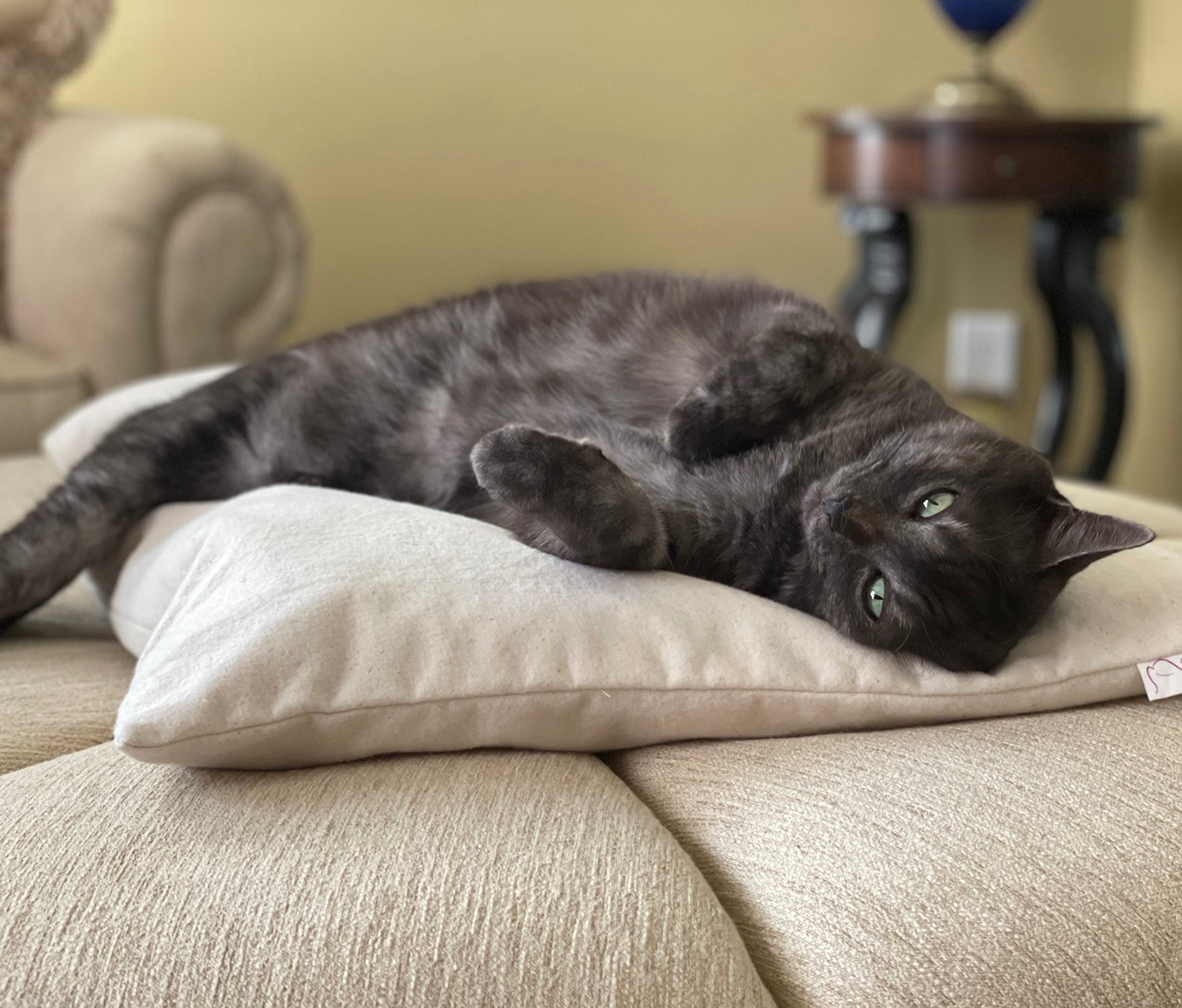 The inner lining is handcrafted from soft organic muslin. Filled with super soft natural Kapok, our cat bed pillow will certainly provide a healthy and comfy sleep to your cat.